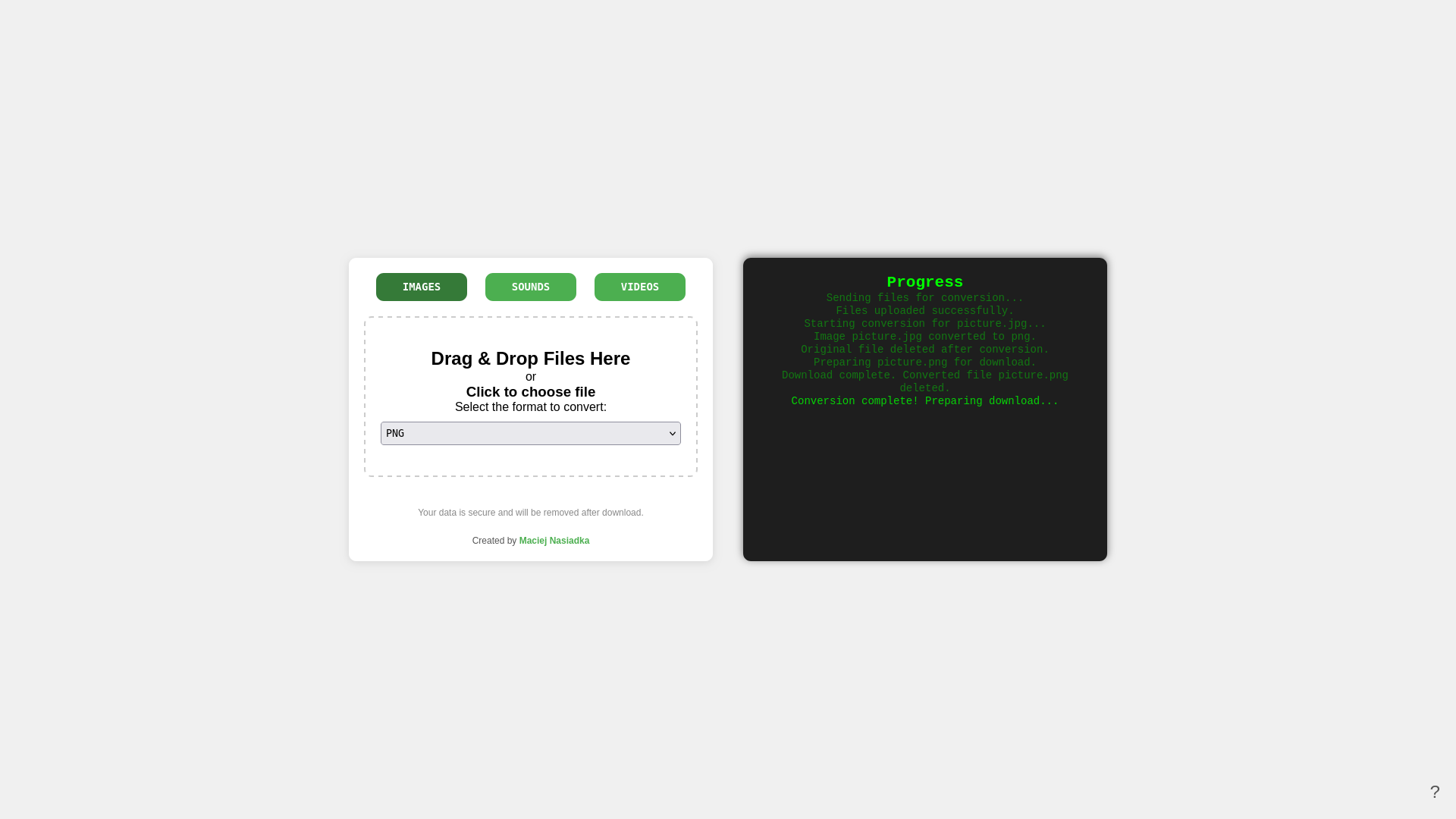 A web-based tool for fast and secure file conversion between multiple formats. Features batch processing, drag-and-drop, and privacy-focused design. It is designed to be intuitive, simple and require minimal input from user